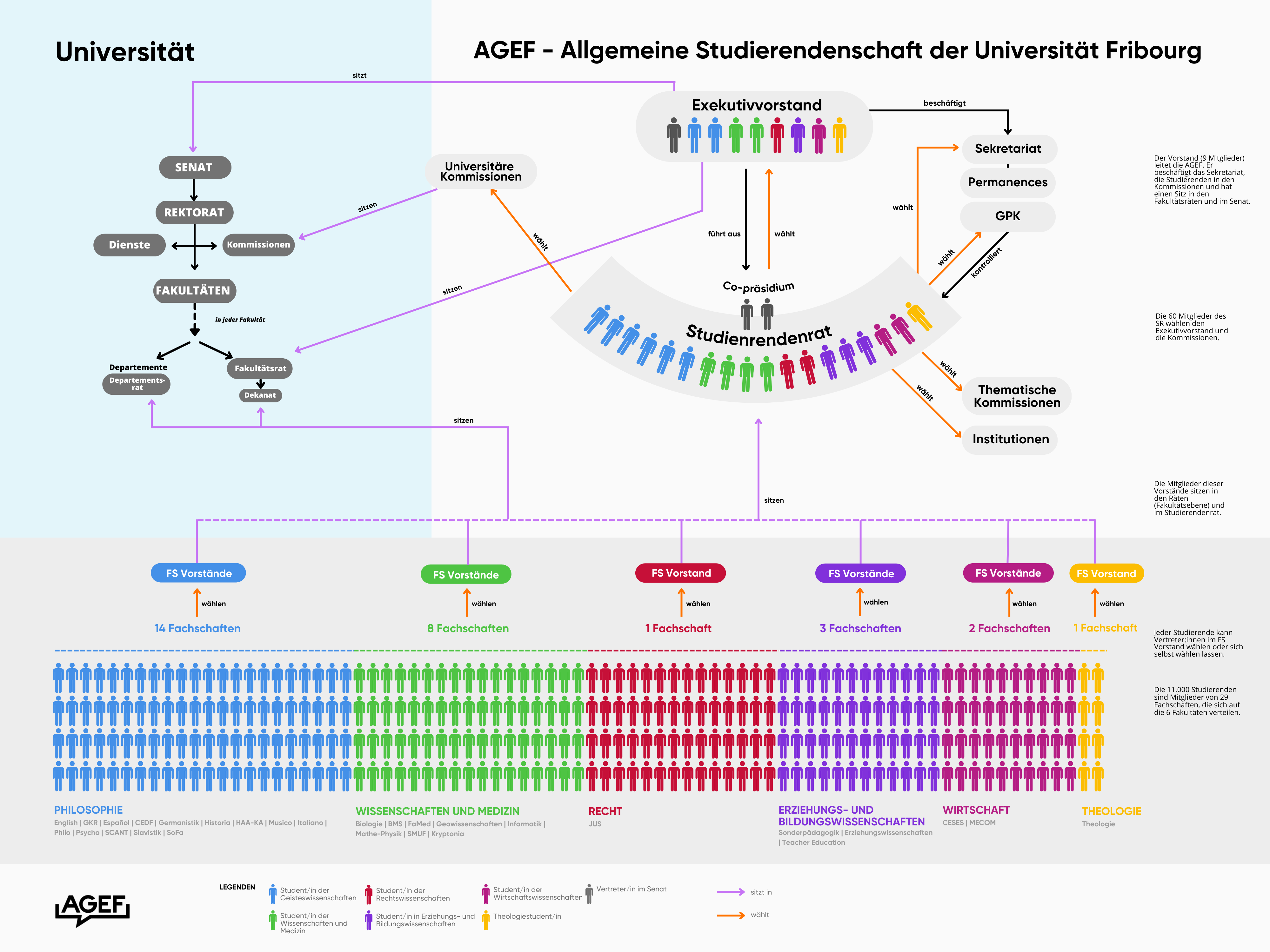 Auf zentraler Ebene wird die AGEF von einem neunköpfigen Exekutivvorstand geleitet, der vom Studierendenrat gewählt wird, der sich aus Vertretern der einzelnen Fachschaften zusammensetzt. Der Vorstand wird von einem Sekretariat unterstützt, das vom Vorstand angestellt und bezahlt wird, während die GPK (die vom SR gewählt wird) dafür sorgt, dass die AGEF-Organe rechtlich einwandfrei funktionieren. Es ist auch möglich, sich in den thematischen Kommissionen der AGEF zu engagieren, um Projekte zu kreieren, oder in den universitären Kommissionen, um die Studierendenschaft zu vertreten. Schließlich kann die AGEF auf die Unterstützung von das Centre Fries, sowie von vielen anderen Mitgliedsverbänden zählen, die jedoch keine politische Macht haben.