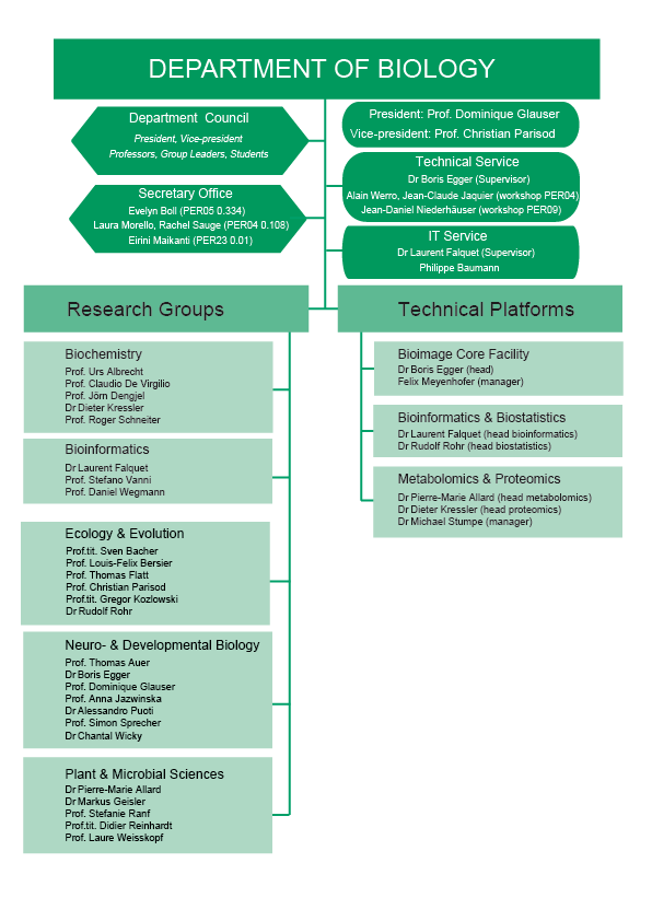 The Department of Biology is organized into five main fields of research and four platforms. It is led by the department council under the direction of a president elected every two years amongst the professors.