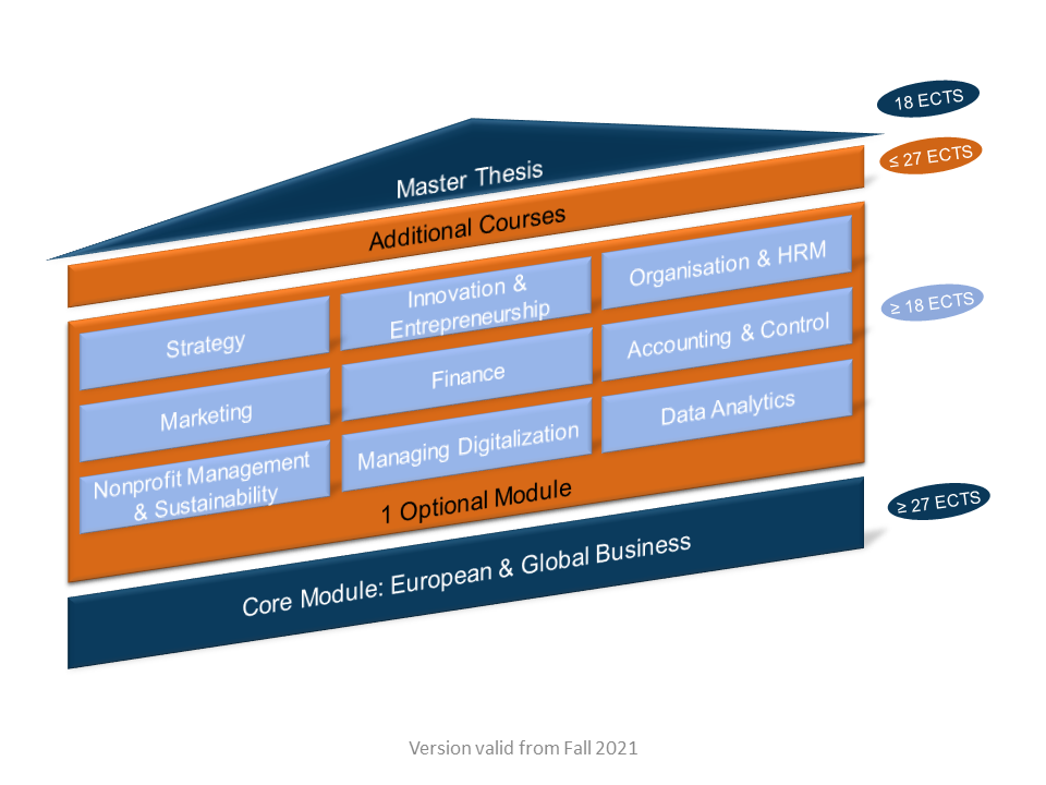 Master Thesis: 24 ECTS A total of at least 120 ECTS have to be validated to obtain the degrees from both institutions. The requirements concerning the modules of the MA in International and European Business have to be fulfilled. This requires at least 27 ECTS in the core module “European and Global Business” plus at least 18 ECTS in one optional module. Thoses courses should be taken mainly in Fribourg, however, it is also possible to accredit courses from Pavia to the modules.