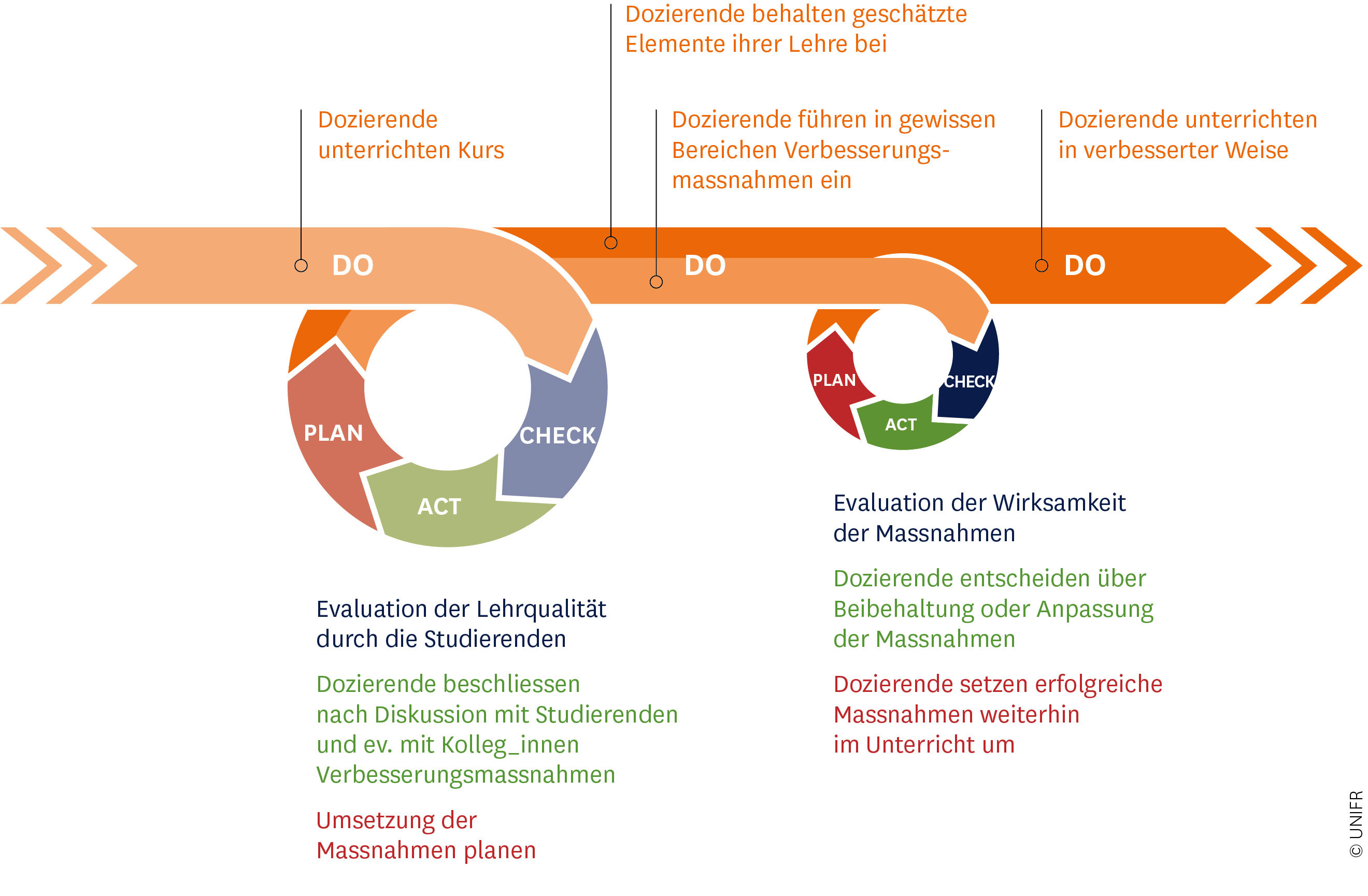 Lehrpersonen, die im Rahmen einer obligatorischen Lehrevaluation ein Ergebnis unter dem Schwellenwert (Median 4 der Antworten auf die ersten 10 Skalafragen) erreicht haben, lassen ihre Lehrveranstaltung im nächstmöglichen Semester neu evaluieren. Die Ergebnisse dienen dazu, Bilanz über die umgesetzten Massnahmen zu ziehen (2. CHECK) und zu entscheiden, ob sie weitergeführt oder angepasst werden sollen (2. ACT & PLAN).