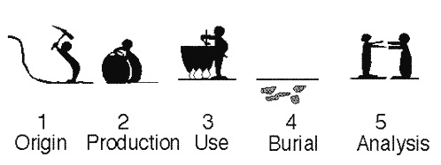 Any ceramic fragment, however insignificant it may appear, can be compared to a potential 'book', because it contains, as if stored on pages, a wealth of information about its history. As shown in the figure below, the lifespan of a piece of pottery can be divided into five steps: