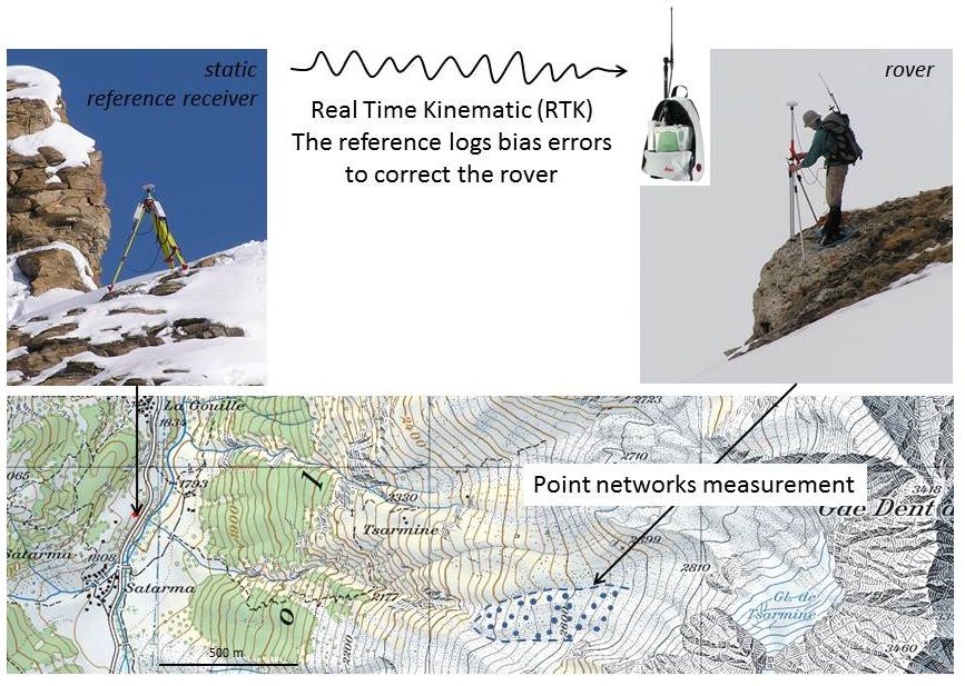 The repeated measurement of points marked on the ground using a differential GPS (GNSS) makes it possible to determine the field vectors of surface displacement on the ground. This method is mainly used for monitoring rock glaciers and landslides kinematics. Measurements are done regularly, usually one to several times a year, over a network of up to more than 100 points. The longest continuous observation series carried out by the Geography Unit dates back to 2001 (rock glaciers of Becs-de-Bosson and Aget).
