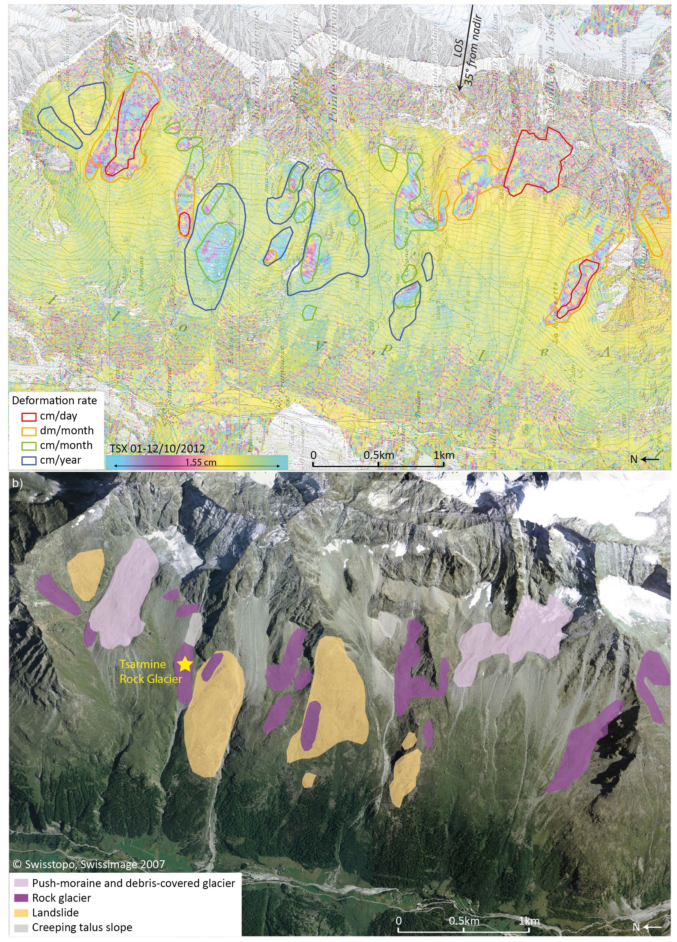 Remote sensing involves the acquisition of remote information (e.g. from an airplane, a satellite, etc.) by means of various instruments (radar, lasers, cameras ...). They allow the documentation of the ground condition by giving information on the ground cover as well as its precise topography at a given moment. In periglacial environment, the repetition of acquisitions offers the possibility in particular to detect, determine and follow surface movements (rock glaciers, landslides, ...).