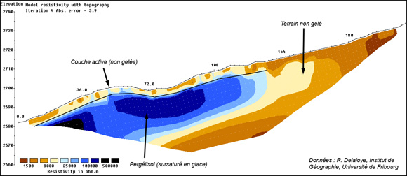 Example of geophysical profile (here geoelectric) carried out on a rock glacier. The blue color (ground resistant to electric current) indicates the presence of ice-rich permafrost; brown colors unfrozen terrain (conductor) -