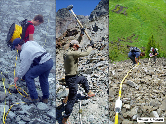 The various materials constituting the subsurface have specific physical properties (resistance to electric current, speed of propagation of seismic waves, ...). The geophysical methods allow to acquire indirect information on the nature of the subsoil (presence of ice, thickness of the underlying materials, etc.). Several study sites are equipped with fixed geophysical profiles, along which measurements can be repeated periodically, allowing the observation of the temporal evolution of particular parameters (temperature, water content, etc.). In the alpine periglacial context, geoelectrics, seismic refraction and ground penetrating radar are currently the most appropriate techniques.