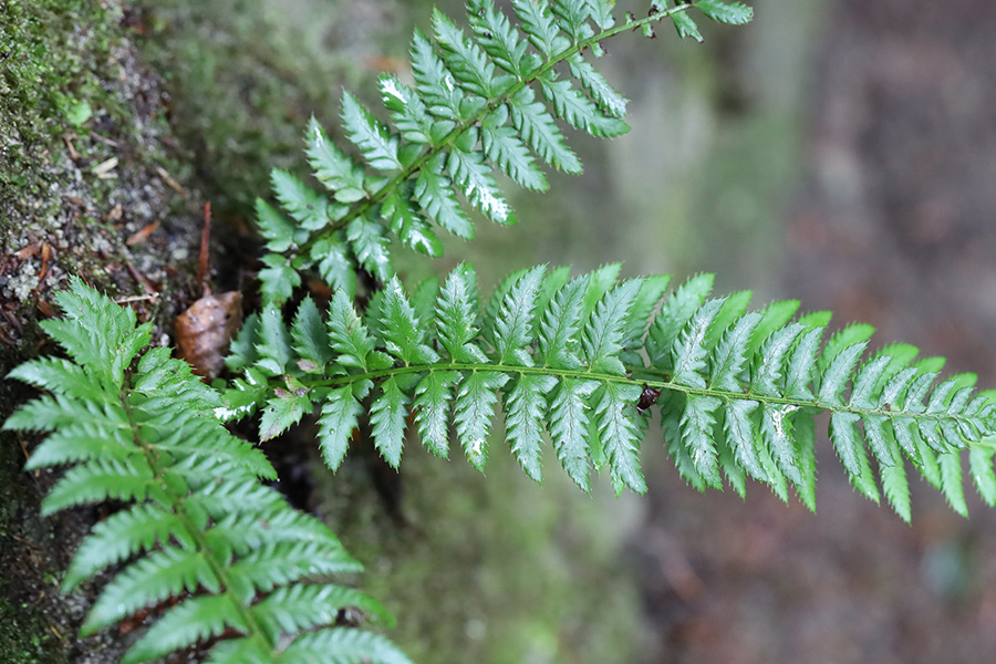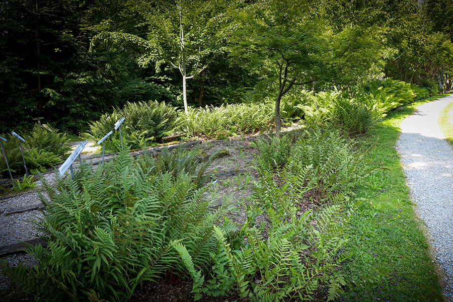 Durch einen Farnhain führt der Pfad ‘Le Secret des fougères’ unter dem Blätterdach eines grossen Ahorns.