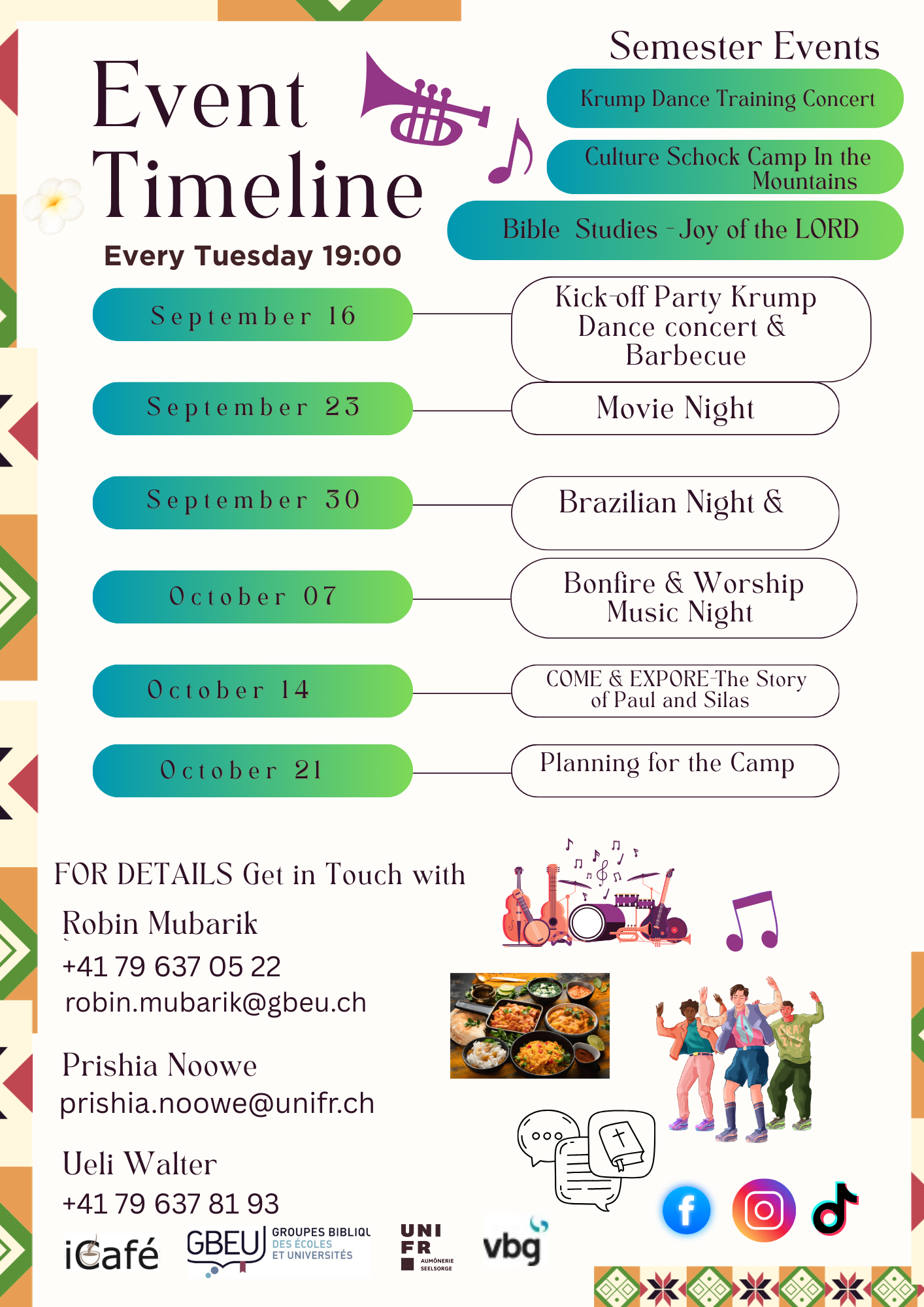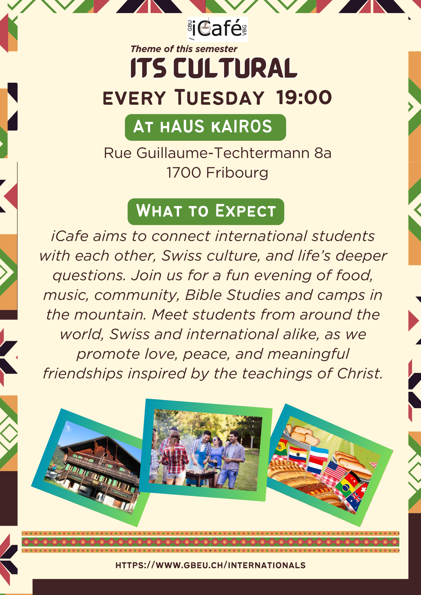 In unseren Gruppentreffen, Camps und Kursen sind alle Menschen willkommen. Unsere Spiritualität orientiert sich an verschiedenen christlichen Traditionen und fusst auf dem altchristlichen Glaubensbekenntnis.Im Haus Kairos finden regelmässig die Treffen der internationalen englischsprachigen Gruppe von VBG/GBU statt:Ihr könnt euch auf die nächsten Termine von iCafé im Haus Kairos freuen:jeden Dienstag um 19 UhrHaus Kairos, Rue Techtermann 8a