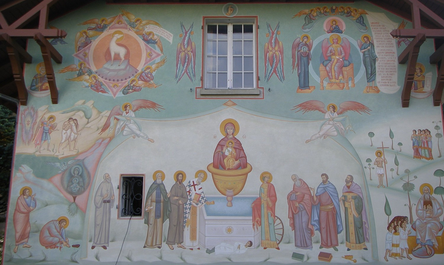 Auf der Darstellung gibt es keine trennenden Mauern. Himmel und Erde wirken zusammen zum Heil der ganzen Schöpfung. Der obere Teil des Freskos nimmt die Motive der Offenbarung des Johannes auf, des letzten Buches der Bibel: Das Lamm repräsentiert Christus, der mit den Engeln und Heiligen für die Vollendung des Reiches Gottes im Neuen Jerusalem wirkt. Die Ikone der Sophia, der Weisheit Gottes, zeigt die Braut des Lammes, die erlöste Schöpfung, die im Heiligen Geist die Person gewordene Gemeinschaft der Erlösten darstellt.