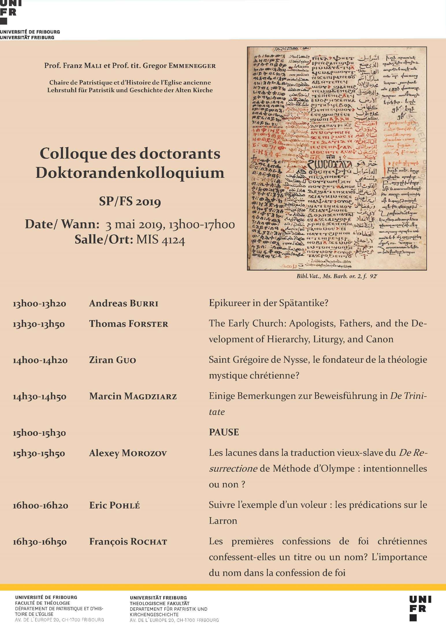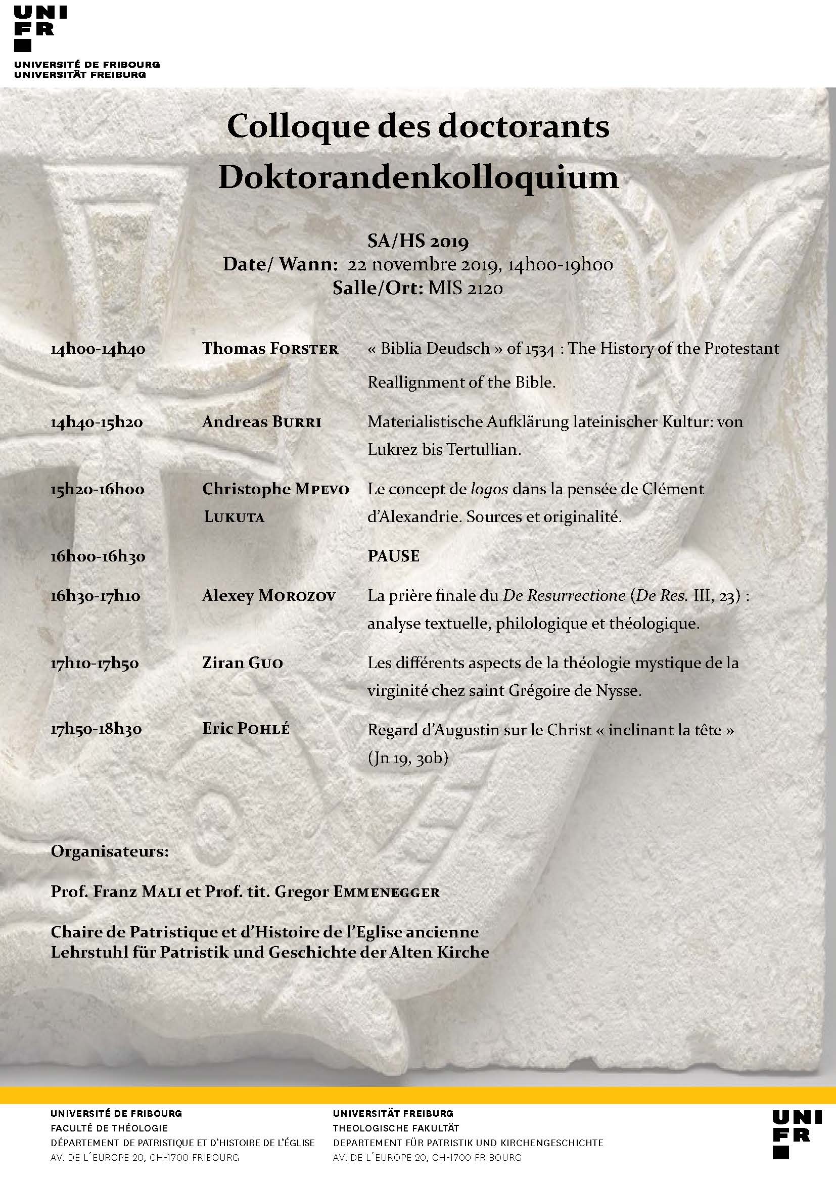 Organisiert und unterstützt von : • Lehrstuhl für Patristik und Geschichte der Alten Kirche (Universität Freiburg) • Schweizerische Patristische Arbeitsgemeinschaft • Conférence Universitaire de Suisse Occidentale • swissuniversities