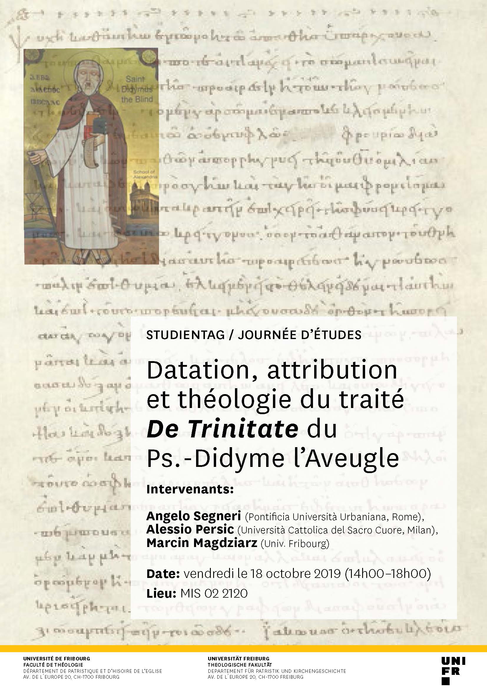 Studientag: Datation, attribution et théologie du traité De Trinitate du Ps.-Didyme l’Aveugle