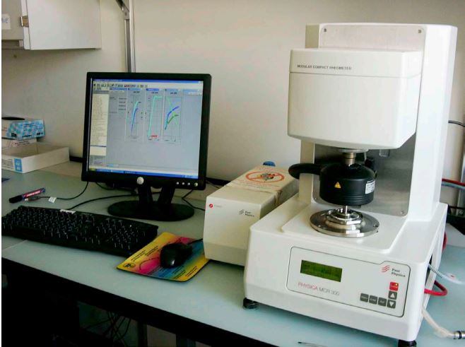 The Paar Physica MCR300 is a commercial stress rheometer, which allows to run stress and strain controlled experiments. For more details see http://www.anton-paar.com.