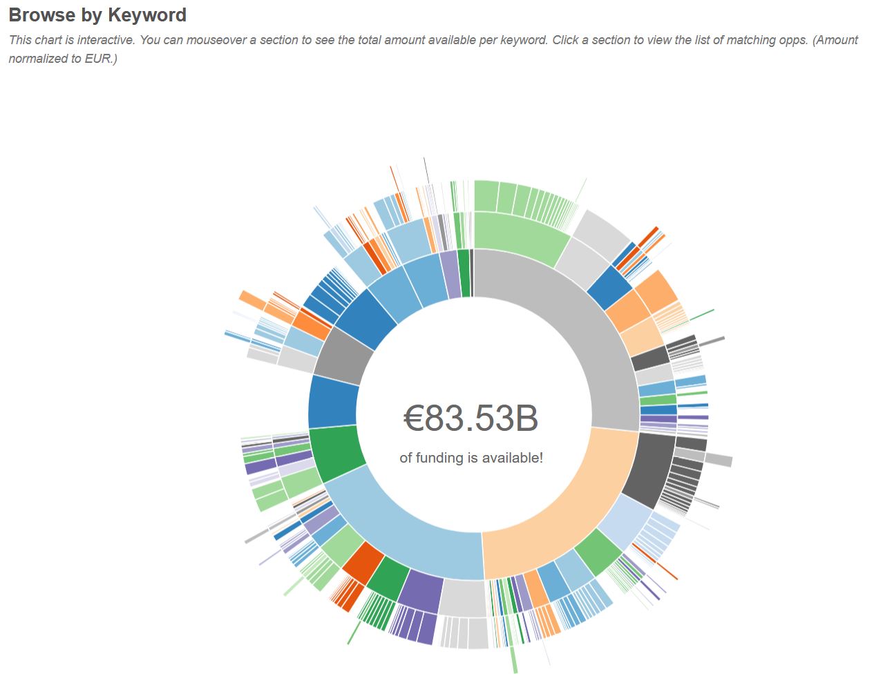 En survolant les différentes parties de la roue, vous aurez une approximation du montant des financements disponibles par thème.