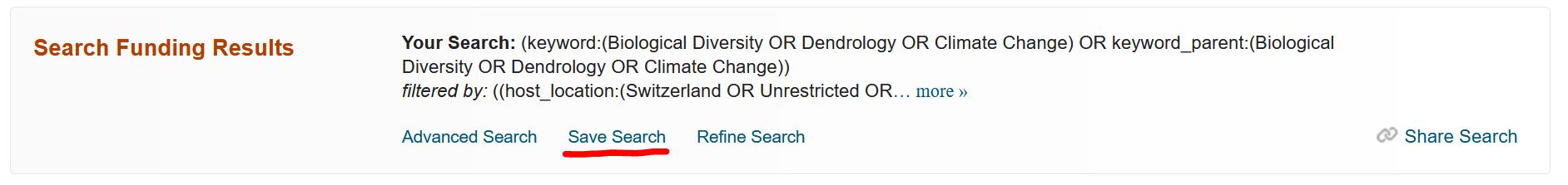 Une fois que vous êtes satisfait·e·s avec les résultats de votre recherche, vous pouvez l'enregistrer et recevoir des mises à jour par courriel chaque fois qu'une nouvelle opportunité de recherche correspondant à votre requête est ajoutée à la base de données. Vous pouvez également enregistrer une recherche et choisir de ne pas recevoir de courriel, mais revenir consulter les résultats de votre requête directement sur Pivot-RP.