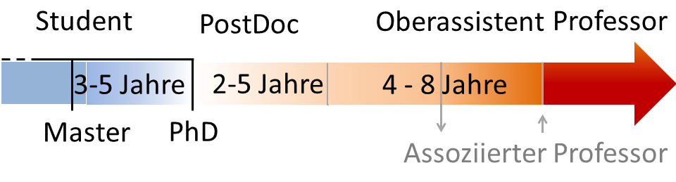 - Circa 4-9 Jahre nach dem Ende des Doktorats sollte ein Forscher über Erfahrungen und Qualifikationen (sowohl in der Forschung als auch in der Lehre) verfügen, um sich für eine Professur bewerben zu können, wie z.B. die Förderprofessuren des Schweizerischen Nationalfonds.