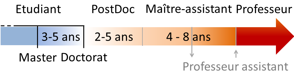 - Environ 2-5 ans après la thèse, il y a la possibilité de postuler à des subsides permettant de démarrer graduellement sa propre activité de recherche. Certains moyens de financement donnent l’accès au statut de Maître-assistant(e) qui n’est pas une étape obligatoire de la carrière académique. Milieu