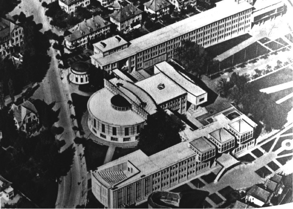 Aufgrund des raschen Wachstums im ersten Drittel des 20. Jh. hatten Studierende und Professoren zuvor lange Zeit mit Platznot zu kämpfen. Die architektonische Innovation wurde von Denis Honegger (ein Schüler Le Corbusiers) konzipiert und gemeinsam mit dem Freiburger Architekten Frédéric Dumas umgesetzt. Aus heutiger Sicht beachtenswert erscheint das Auditorium C, das anfänglich unter freiem Himmel stand (siehe untere Bildhälfte)!