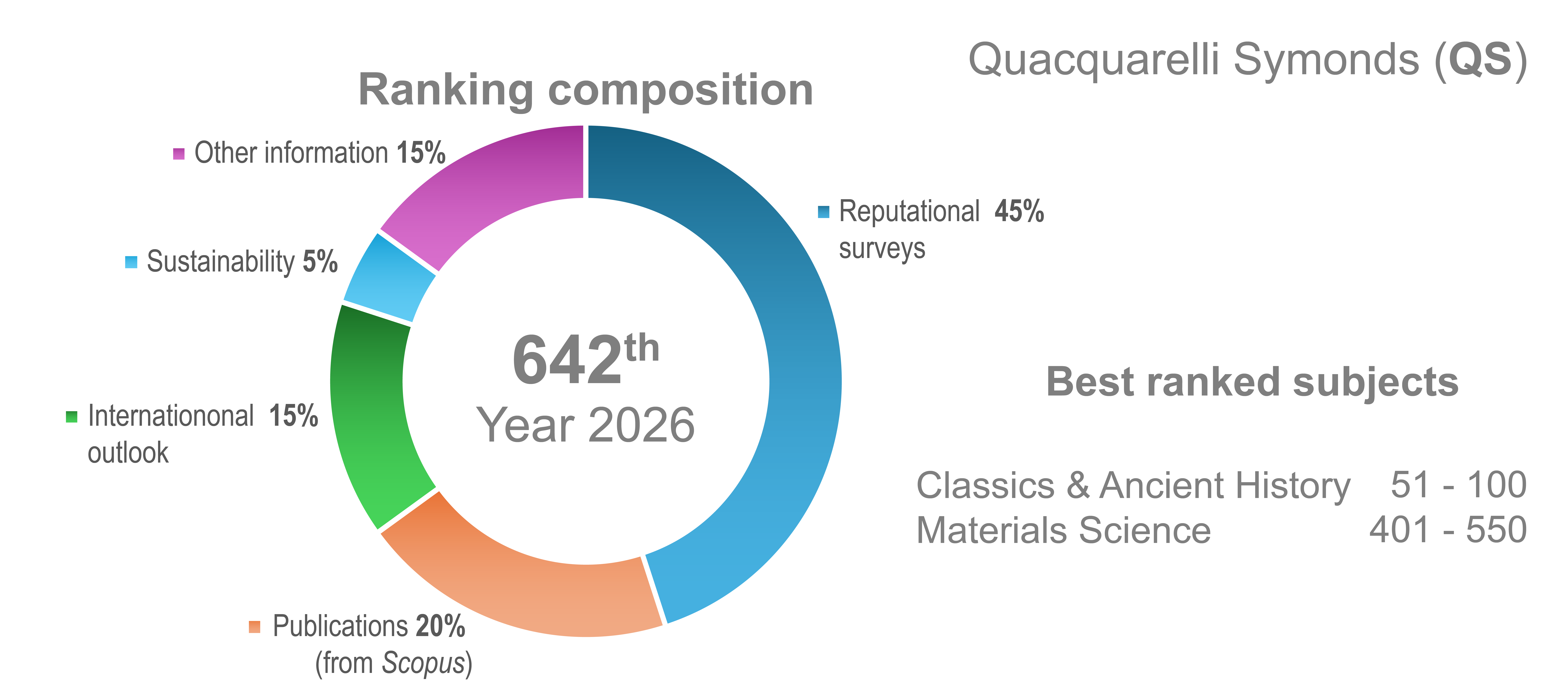 Le paysage des classements a évolué, passant des classements académiques généraux à des sous-classements spécialisés, axés sur des disciplines scientifiques spécifiques, des zones géographiques particulières et des critères émergents comme l’impact et la durabilité. Les sections suivantes visent à reconnaître et contextualiser nos résultats les plus récents dans les classements les plus significatifs: